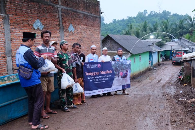 Malang – LAZIS Al Haromain memberikan bantuan Tanggap Musibah Banjir di Malang Selatan, Jum’at (28/11/2024). Kegiatan dilakukan di Kampung Raas, Sendang Biru, Malang. Volume air sempat sampai setinggi dada orang dewasa dan masuk ke rumah warga. (Rizal)